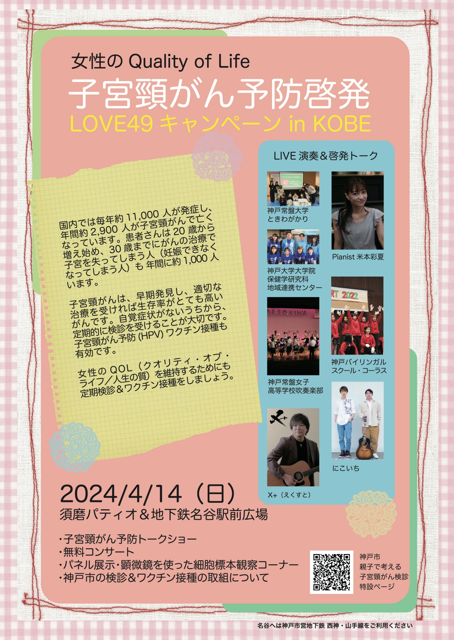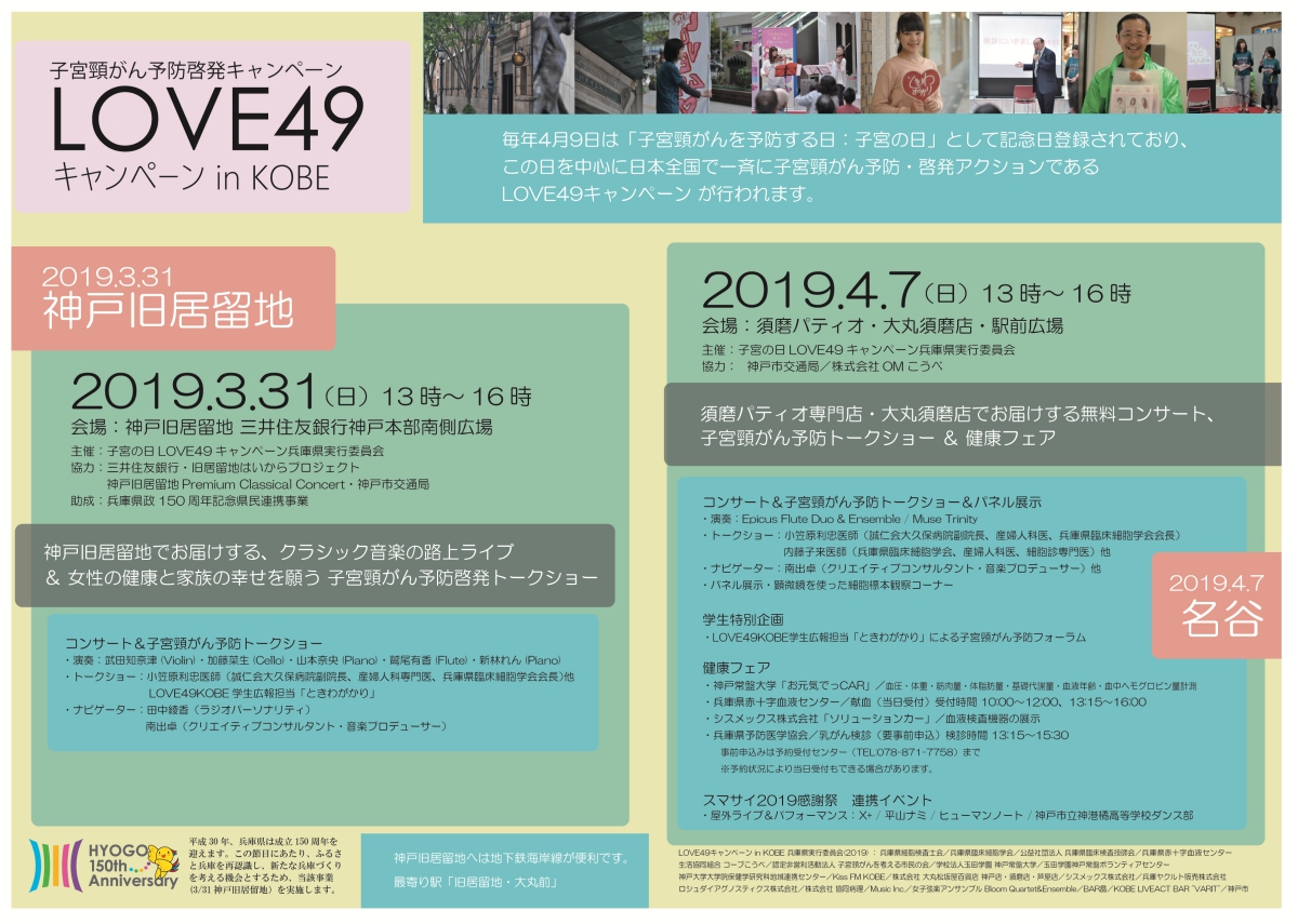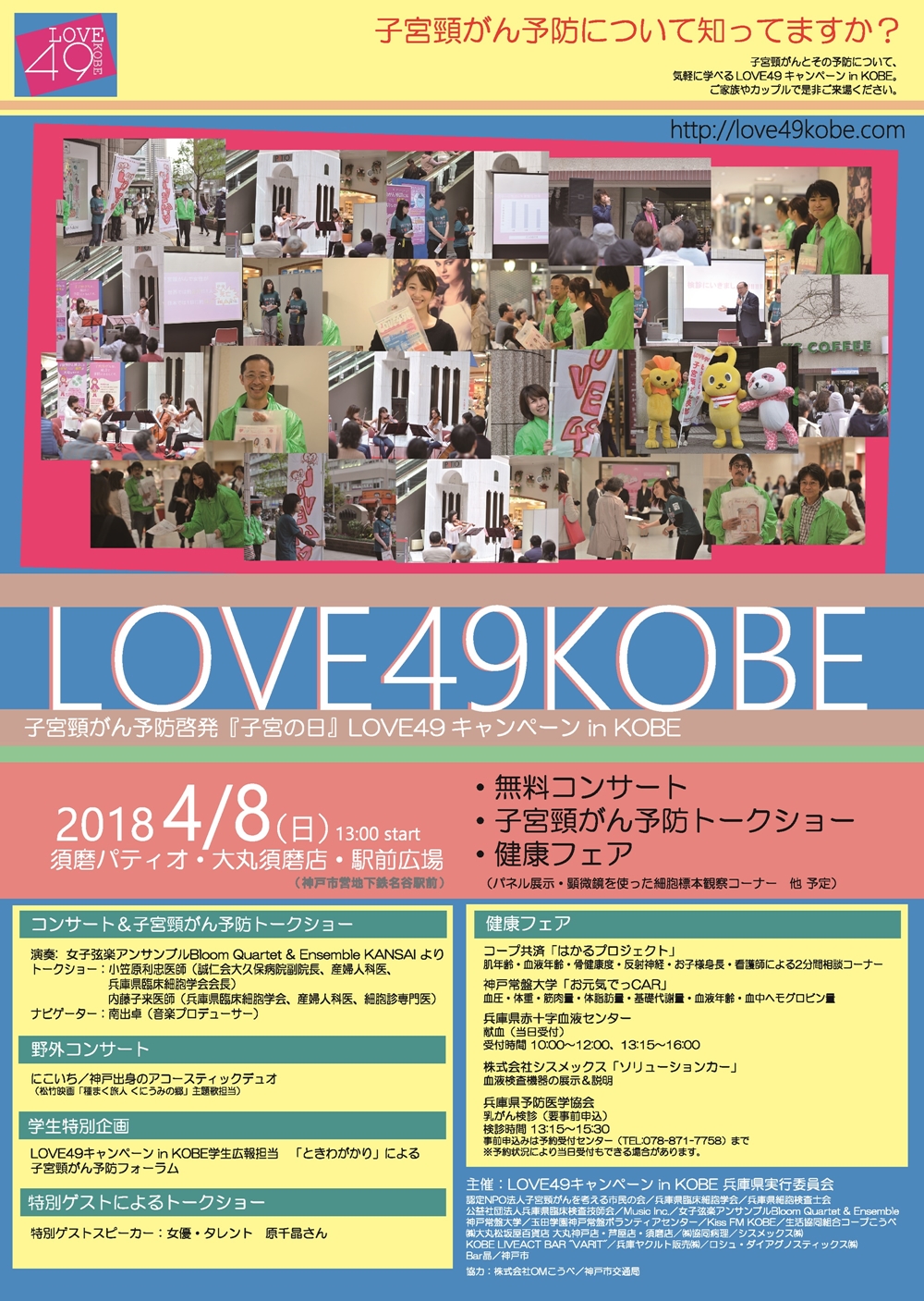開催内容:ピアニスト米本彩夏、常盤女子高等学校 吹奏楽部、神戸バイリンガルスクールの子供たちによる無料ミニコンサート。X+(エクスト)、にこいち、平山ナミ、TAKERUによる無料屋外LIVE、LOVE49KOBE学生広報担当「ときわがかり」による発表、神戸大学大学院保健学研究科による発表、神戸市からのお知らせ、子宮頸がん啓発チラシ等の配布、子宮頸がん啓発パネルの展示、顕微鏡での子宮頸がん細胞標本の観察コーナー、神戸市からの検診のお知らせ、子宮頸がん予防啓発情報パック&プレゼント配布。