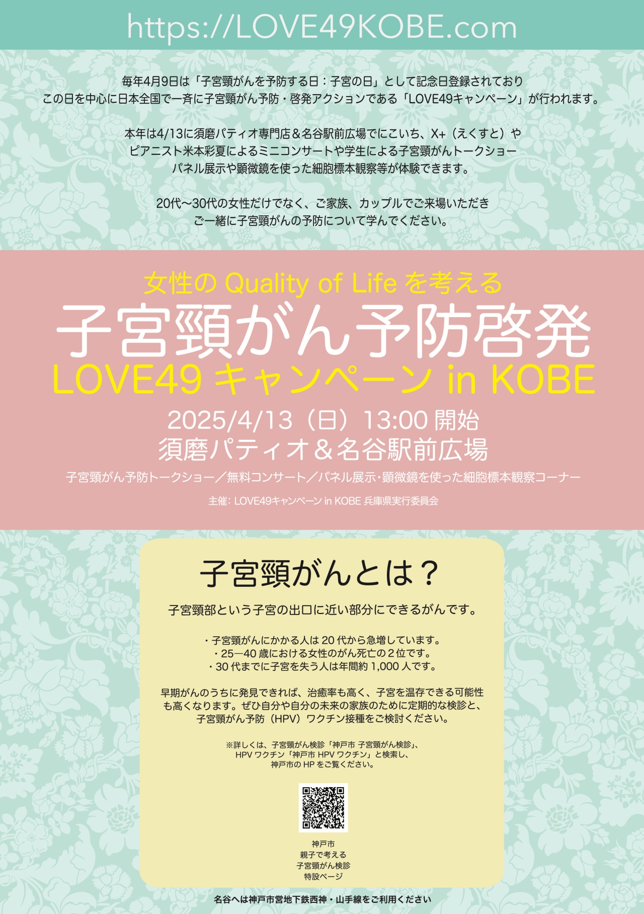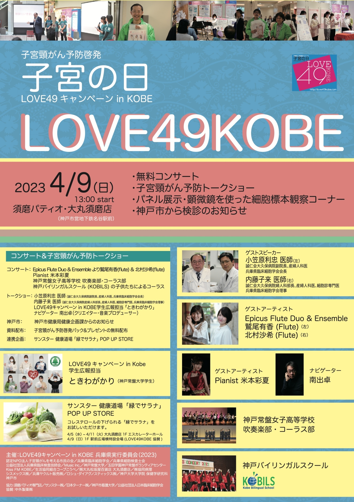 毎年4月9日は「子宮頸がんを予防する日:子宮の日」として記念日登録されており、 この日を中心に日本全国で一斉に子宮頸がん予防・啓発アクションである「LOVE49キャンペーン」が行われます。 LOVE49キャンペーン in KOBEは認定NPO法人子宮頸がんを考える市民の会が主催する、子宮頸がん定期検診の必要性を伝えるためのLOVE49プロジェクトを発端に、神戸市で派生した啓発キャンペーンです。