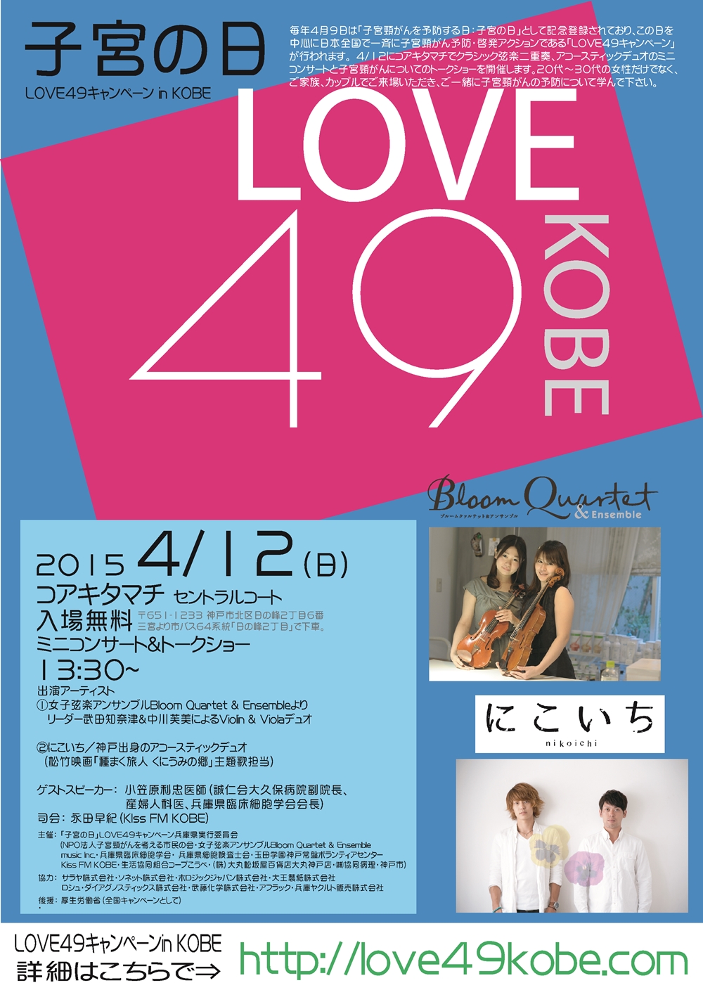 2015年は4月12日(日)北区のコアキタマチにて『子宮の日』LOVE49キャンペーン in KOBE~ミニコンサート&トークショーを開催します。