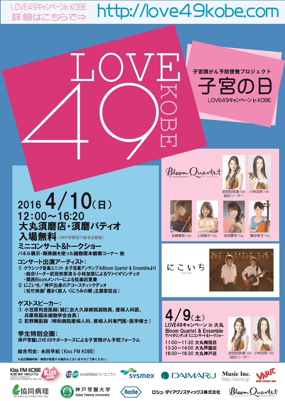 2016年は4月10日(日)神戸市須磨区の大丸須磨店・須磨パティオにて『子宮の日』LOVE49キャンペーン in KOBE~ミニコンサート&トークショーを開催します。