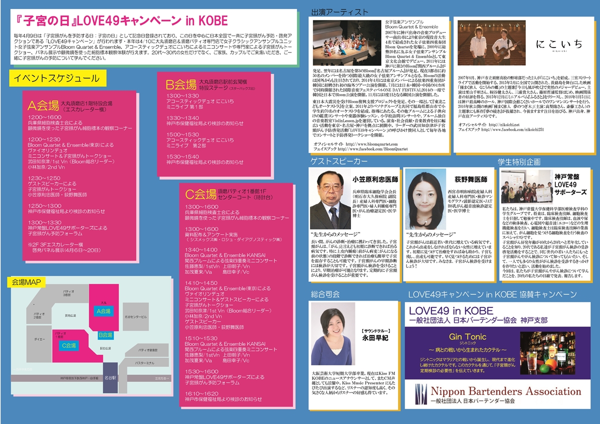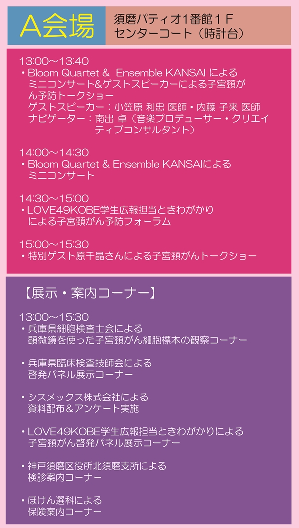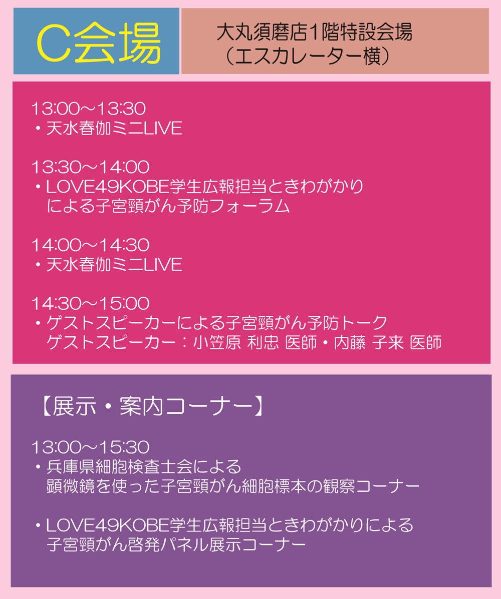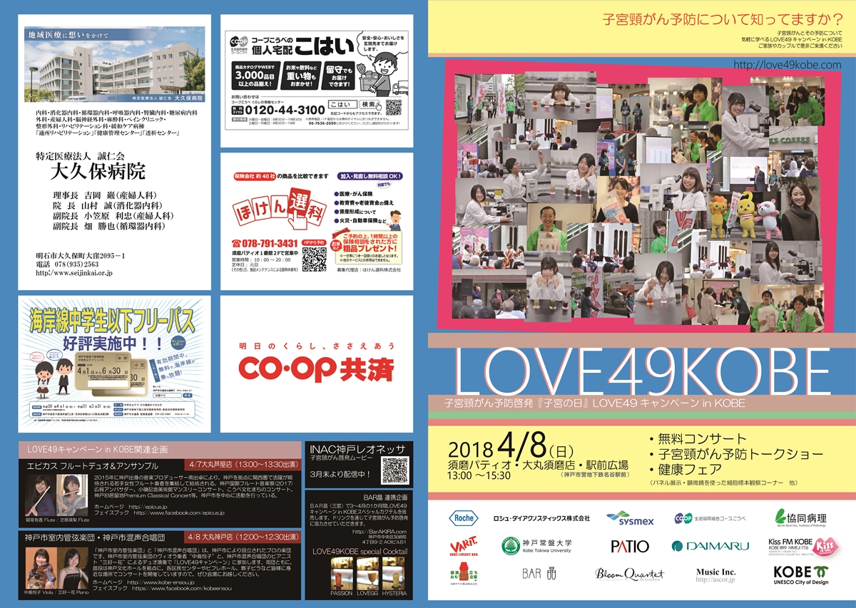 開催内容:ピアニスト米本彩夏、常盤女子高等学校 吹奏楽部、神戸バイリンガルスクールの子供たちによる無料ミニコンサート。X+(エクスト)、にこいち、平山ナミ、TAKERUによる無料屋外LIVE、LOVE49KOBE学生広報担当「ときわがかり」による発表、神戸大学大学院保健学研究科による発表、神戸市からのお知らせ、子宮頸がん啓発チラシ等の配布、子宮頸がん啓発パネルの展示、顕微鏡での子宮頸がん細胞標本の観察コーナー、神戸市からの検診のお知らせ、子宮頸がん予防啓発情報パック&プレゼント配布。