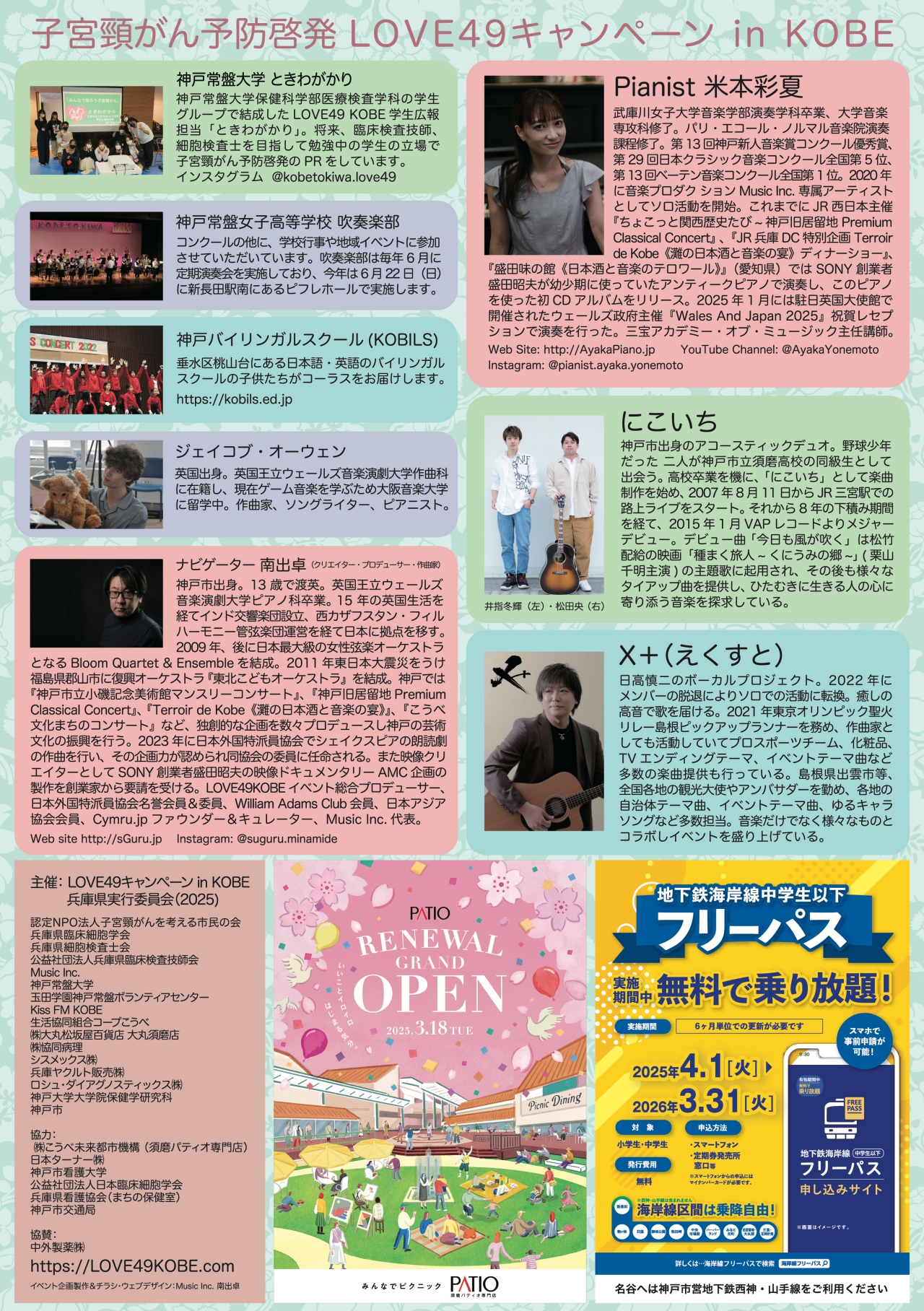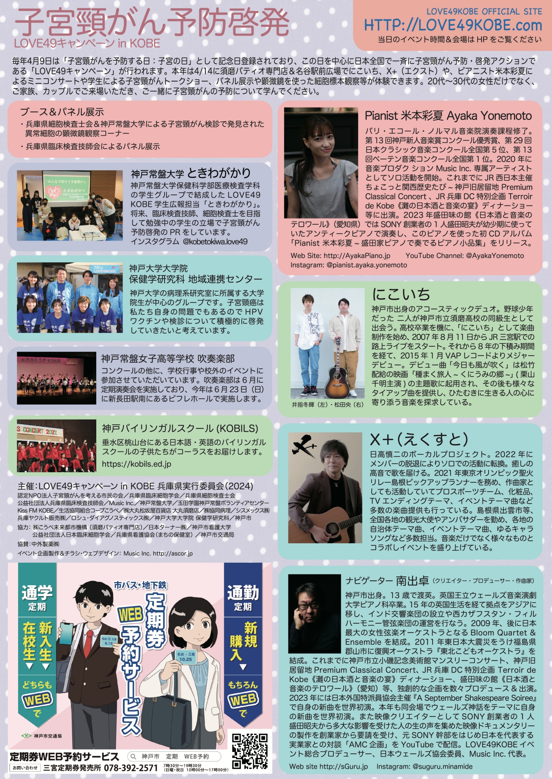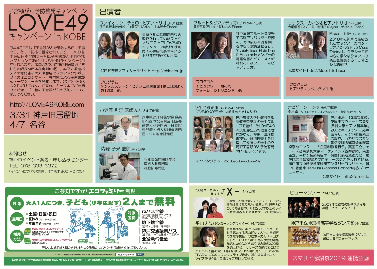 開催内容:ピアニスト米本彩夏、常盤女子高等学校 吹奏楽部、神戸バイリンガルスクールの子供たちによる無料ミニコンサート。X+(エクスト)、にこいち、平山ナミ、TAKERUによる無料屋外LIVE、LOVE49KOBE学生広報担当「ときわがかり」による発表、神戸大学大学院保健学研究科による発表、神戸市からのお知らせ、子宮頸がん啓発チラシ等の配布、子宮頸がん啓発パネルの展示、顕微鏡での子宮頸がん細胞標本の観察コーナー、神戸市からの検診のお知らせ、子宮頸がん予防啓発情報パック&プレゼント配布。
