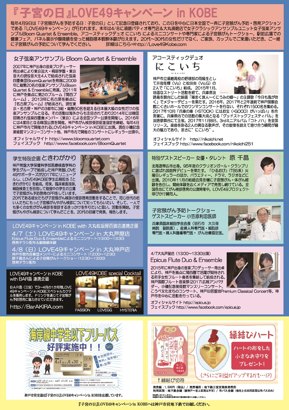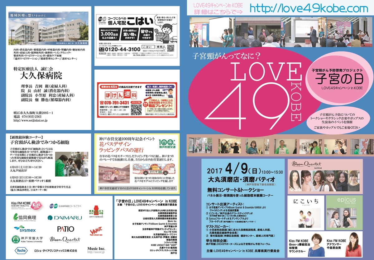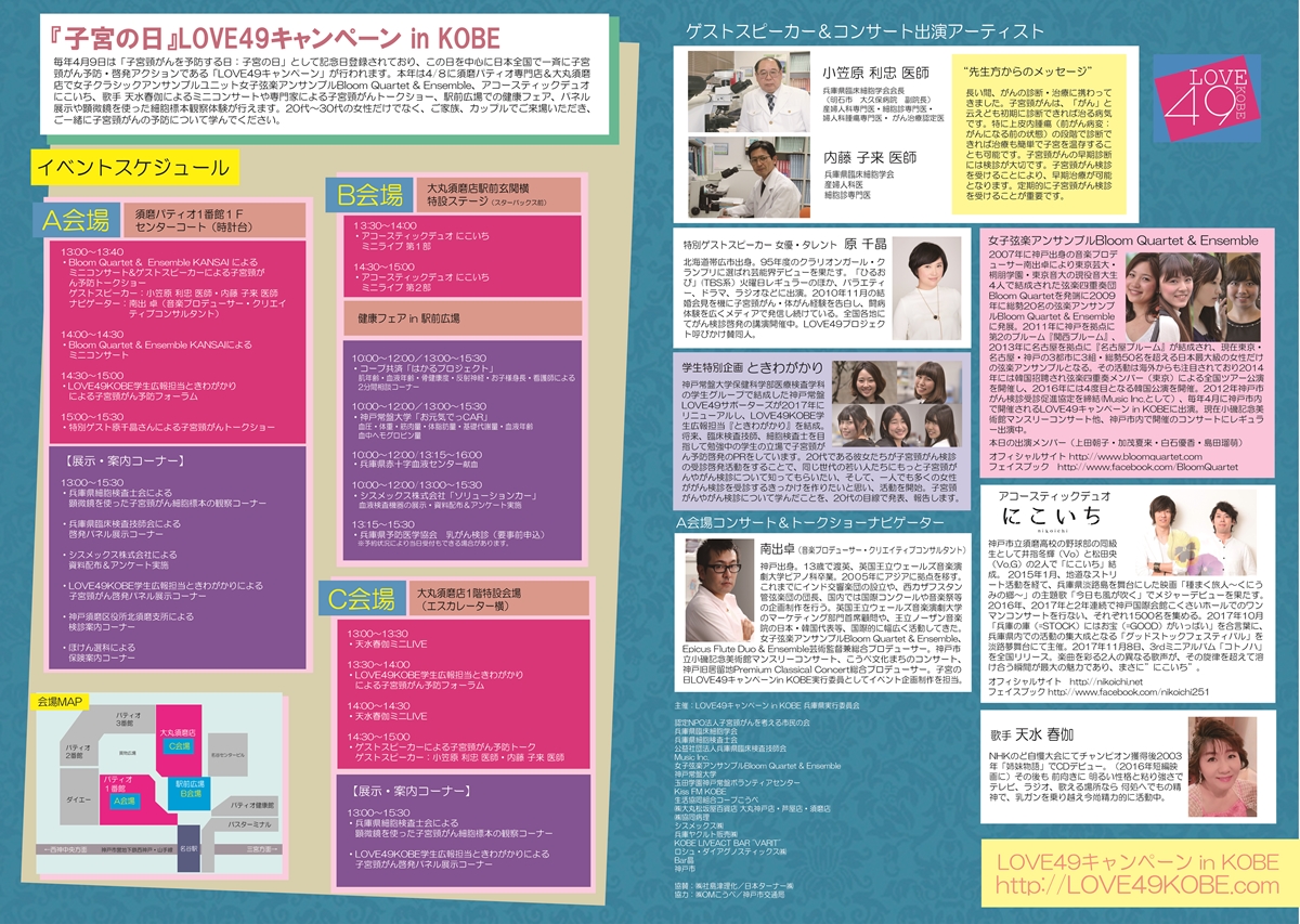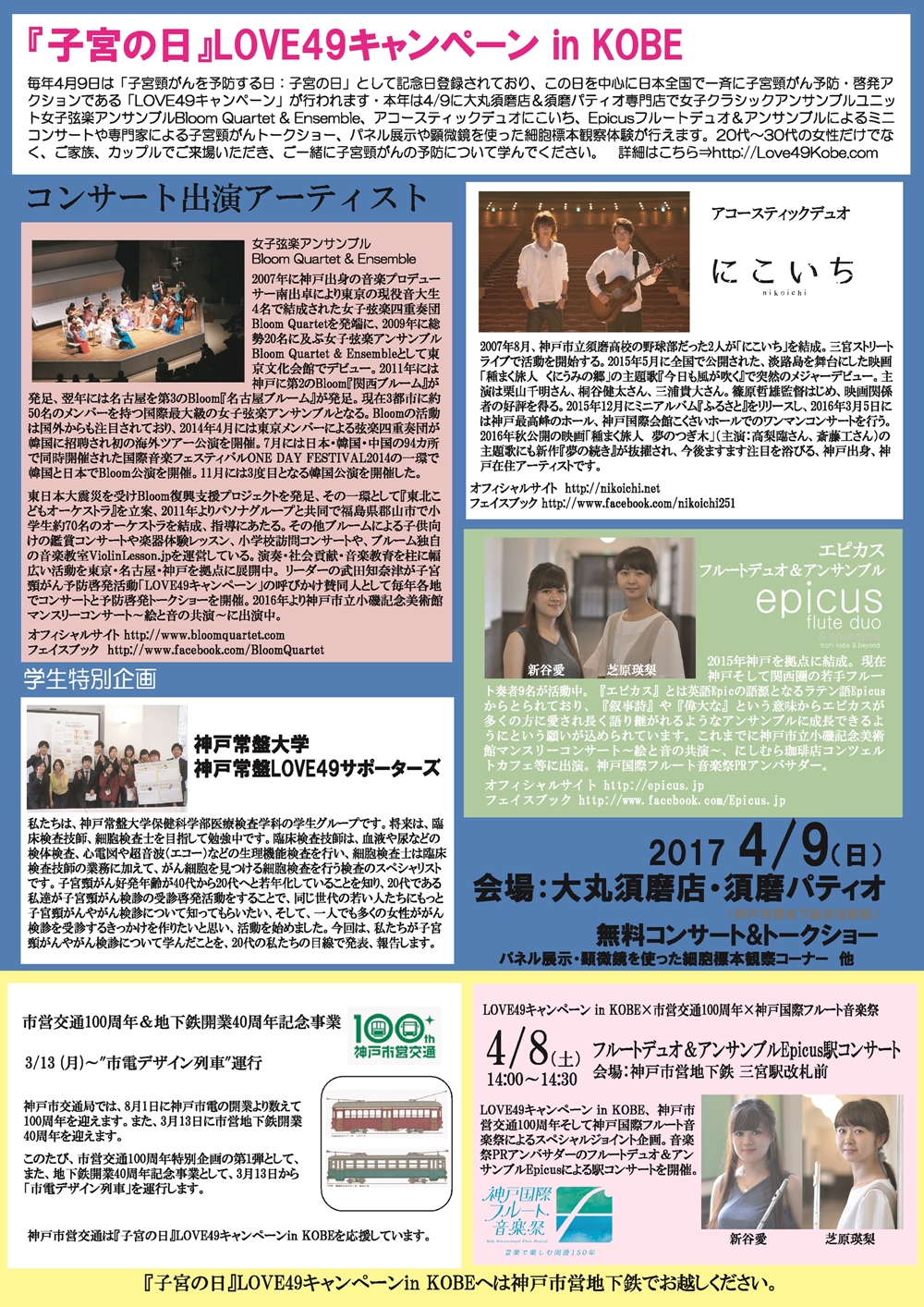 2017年は4月9日(日)神戸市須磨区の大丸須磨店・須磨パティオにて『子宮の日』LOVE49キャンペーン in KOBE~ミニコンサート&トークショーを開催します。