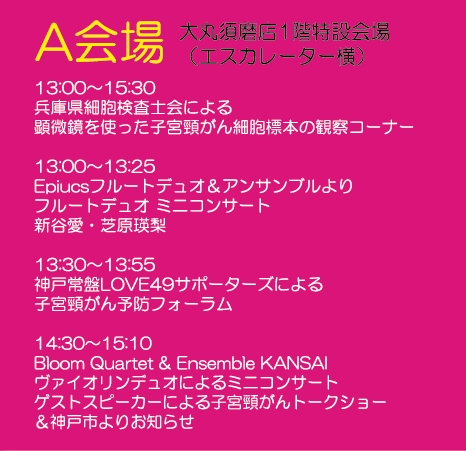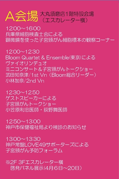 開催内容:ピアニスト米本彩夏、神戸バイリンガルスクールの子供たちによる屋内無料ミニコンサート。X+(エクスト)、にこいち、他による屋外無料LIVE、LOVE49KOBE学生広報担当「ときわがかり」による発表、神戸市からのお知らせ、子宮頸がん啓発チラシ等の配布、子宮頸がん啓発パネルの展示、顕微鏡での子宮頸がん細胞標本の観察コーナー、神戸市からの検診のお知らせ、子宮頸がん予防啓発情報パック&プレゼント配布。