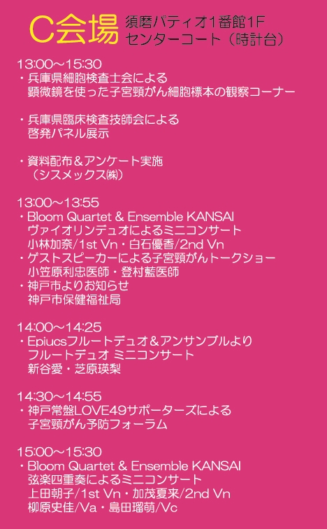 開催内容:女子弦楽アンサンブルBloom Quartet & Ensembleによるミニコンサート、産婦人科専門医による子宮頸がんトークショー、神戸常盤大学生による発表、にこいちによるミニコンサート、Epicusフルートデュオ&アンサンブルによるミニコンサート、子宮頸がん啓発チラシ等の配布、子宮頸がん啓発パネルの展示、顕微鏡での子宮頸がん細胞標本の観察コーナー等、アンケート実施