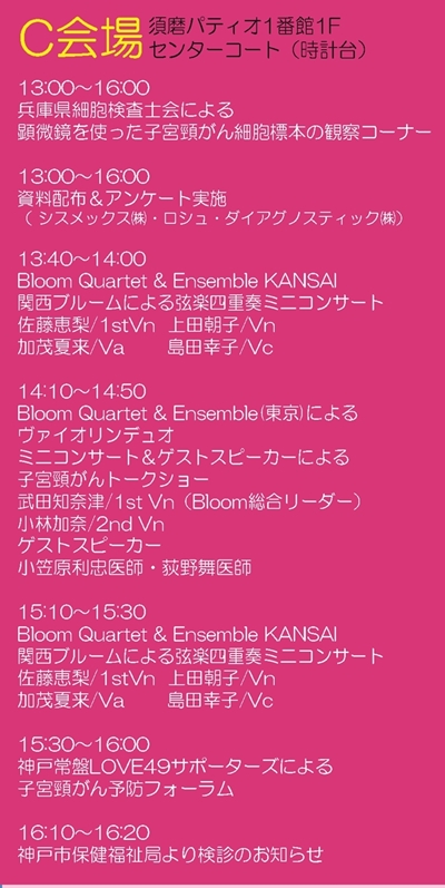 開催内容:女子弦楽アンサンブルBloom Quartet & Ensemble によるミニコンサート、子宮頸がんトークショー、にこいちによるミニコンサート、子宮頸がん啓発チラシ等の配布、子宮頸がん啓発パネルの展示、顕微鏡での子宮頸がん細胞標本の観察コーナー等
